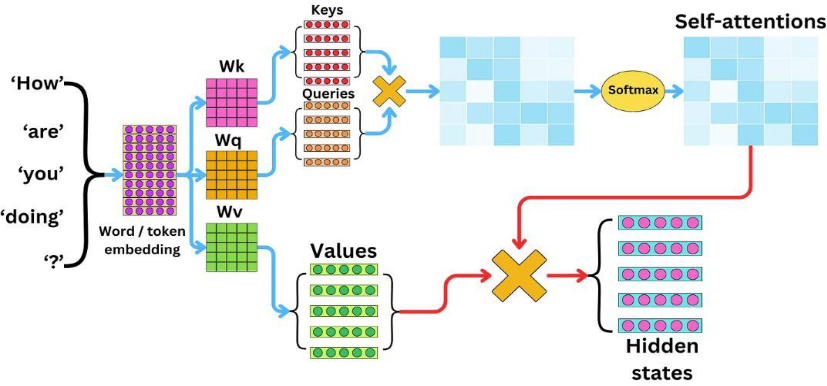 对应NLP(自然语言处理)任务:模型需要理解句子中每个词(“How are you doing?”)的语义,并找到词与词之间的关联。