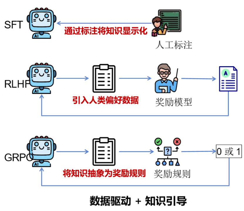 上图是DeepSeek-R1-Zero推理模型的训练框架,融合数据驱动与知识引导的双重策略——SFT(监督微调)利用人工标注显式编码知识,RLHF(人类反馈强化学习)引入偏好数据优化对齐,GRPO(规则抽象强化学习)将专家经验转化为0/1奖励规则,形成“人工标注修正基础能力+强化学习激发高阶推理”的协同训练范式,最终构建出兼顾准确性、逻辑性与可解释性的通用推理智能体。