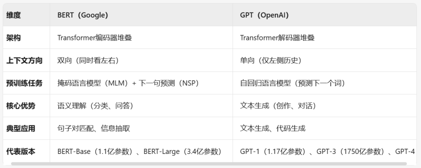 下表对比了两种技术路线的区别,简单来说:BERT更像是「理解专家」,它的技术从双向理解文本,强调“倒背如流”的重要性。这种训练让它擅长理解语义,比如判断两个句子是否相关,或者从文章中提取答案。但缺点是无法直接写文章——就像学霸会做题,但未必会写小说。