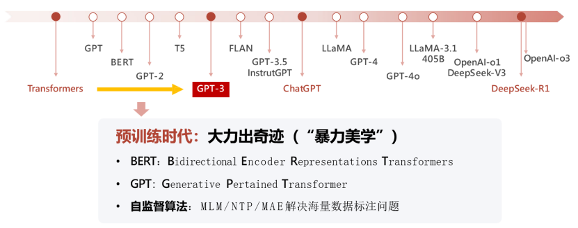 Transformer模型提出后,大模型迎来了突破性进展,机器学习的范式发生了变化,开始逐渐转向深度学习,并进入了预训练时代,强调训练数据规模和质量的重要性,即「大力出奇迹」:投喂大量的数据,模型的理解能力会有显著提升。