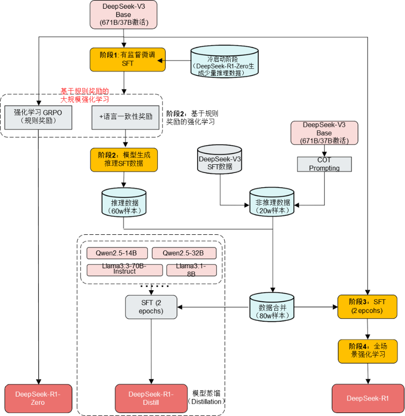 阶段1:DeepSeek-R1-Zero生成少量推理数据+SFT =>为V3植入初步推理能力(冷启动)