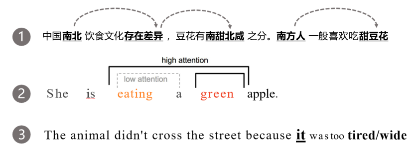 以第二句话为例:eating和apple、green和apple是两组强相关词汇,而eating和green是一组弱相关词汇。