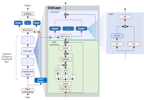 针对安全垂直领域多场景化的应用需求,360独创了紧凑型多专家协同大模型(CCoE)架构,该架构与模型基座解耦并具备迁移能力,使得专项任务无需训练大规模基座参数。在模型基座之上,360针对各类安全研判、分析、生成等任务设计了相互独立的“专家”,即插即用,少许训练路由参数就能即可完成新任务“专家”扩展工作。