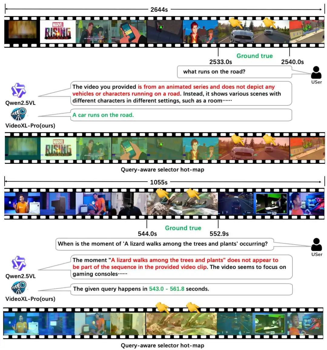 此外,为了增强模型对超长视频理解能力,模型还引入了查询选择器,使得在输入上下文超过限制时模型能够选择性关注和查询有关的片段。