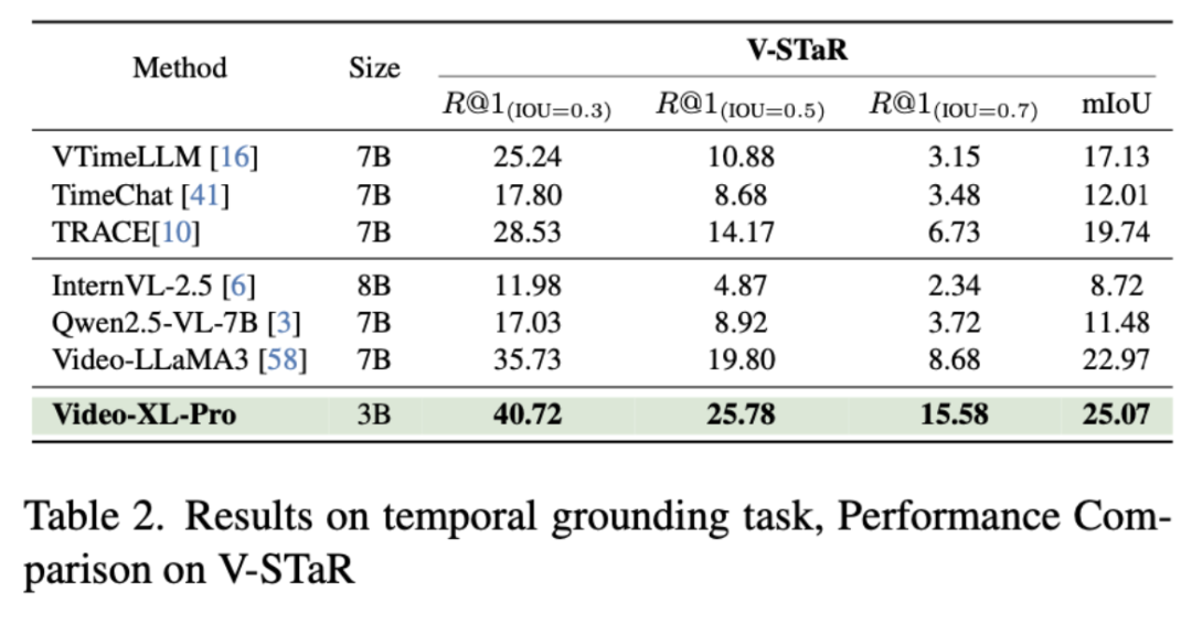 Video-XL-Pro-3B在最新的V-STaR长视频时间基准测试斩获25.07的mIoU得分,在IoU>0.7时仍能达到15.58的准确率,远上超越一众知名开源模型,包括InternVL2.5-8B和Qwen2.5-VL-7B,并超越上一代冠军Video-LLaMA3,展现了卓越的长视频时间理解能力,并且在Charades-STA上也有着不俗的表现。