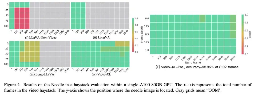 Video-XL-Pro还进行了视频「大海捞针」测试来评估其处理超长上下文的能力。得益于ReCot模块和查询选择器的设计,使得模型可以输入极长的上下文序列,在相同硬件条件下,模型可以以8192帧为输入,达到了近99%的准确率。