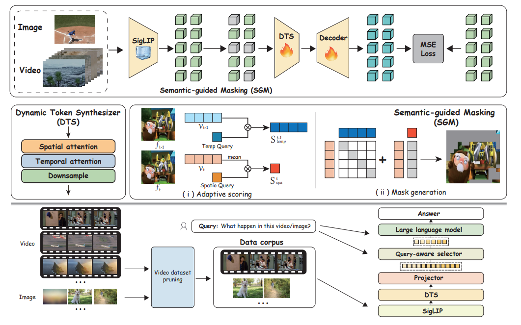 Video-XL-Pro的核心在于其提出的重构性令牌压缩技术(ReCoT),该技术通过自监督学习生成全面且紧凑的视频令牌,显著提升了视频理解的效率和质量。ReCoT包含两个关键组件:动态令牌合成器(DTS)和语义引导掩码(SGM)。