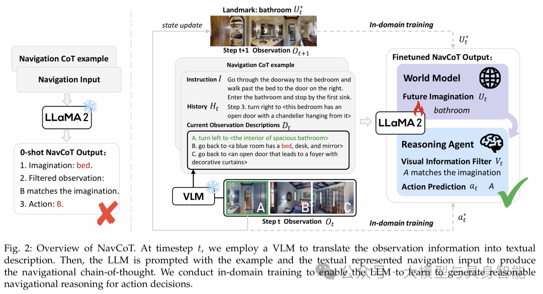 上图展示了NavCoT的完整工作流程:首先通过视觉到文本系统将环境图像转换为文字描述,然后LLM基于指令、历史轨迹和当前观察,依次完成未来想象、视觉信息过滤和行动预测三个步骤,形成可解释的推理链。