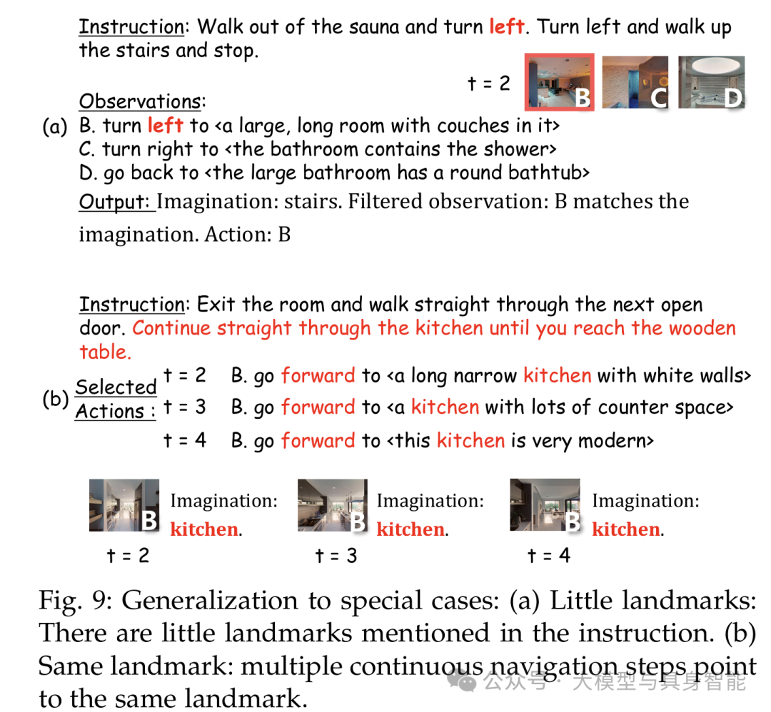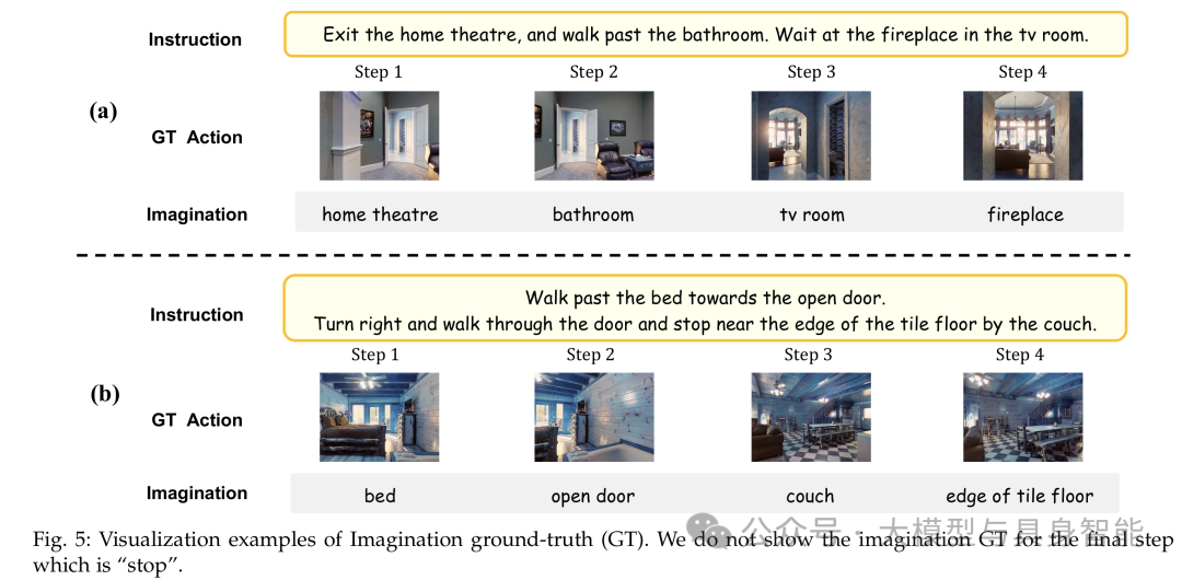 上图展示了模型生成的想象真值示例,即使地标在图像中占比很小(如图中步骤2的"水槽"),系统仍能准确识别并生成对应的想象描述。