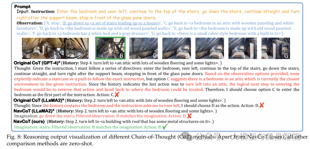 受人类导航时会预先设想前方场景的启发,NavCoT让模型在每个决策步先生成对下一观察的想象(如"敞开的门"、"楼梯"等)。这些想象并非凭空产生,而是严格基于指令中提到的对象或场景,确保推理始终围绕任务目标展开。