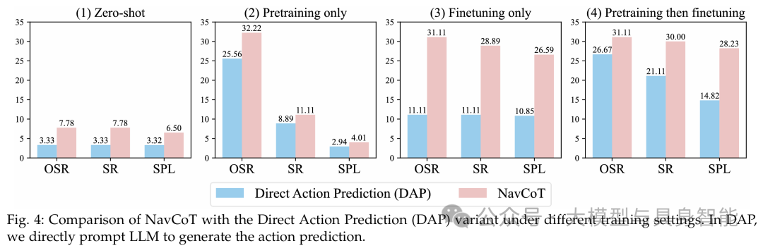 上图展示了NavCoT的完整工作流程:首先通过视觉到文本系统将环境图像转换为文字描述,然后LLM基于指令、历史轨迹和当前观察,依次完成未来想象、视觉信息过滤和行动预测三个步骤,形成可解释的推理链。在R2R数据集上,基于LLaMA 2的NavCoT通过简单微调,在成功率(SR)和路径长度加权成功率(SPL)上比基于GPT-4的方法提升约7个百分点,同时单步推理时间从9.8秒缩短至0.5秒。实验表明,