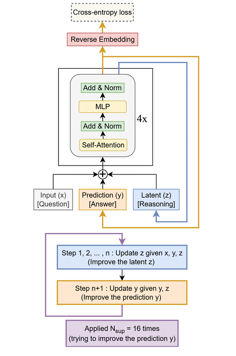 提出了Tiny Recursive Model (TRM),该模型仅包含一个两层的神经网络,通过递归更新潜在推理状态z和预测答案y来逐步改进答案。