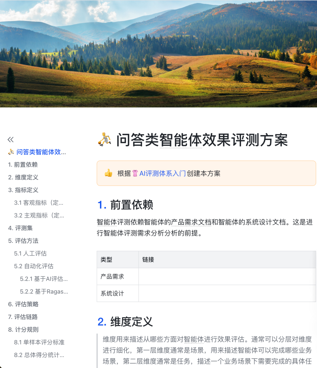 智能体评测依赖智能体的产品需求文档和智能体的系统设计文档。这是进行智能体评测需求分析分析的前提。