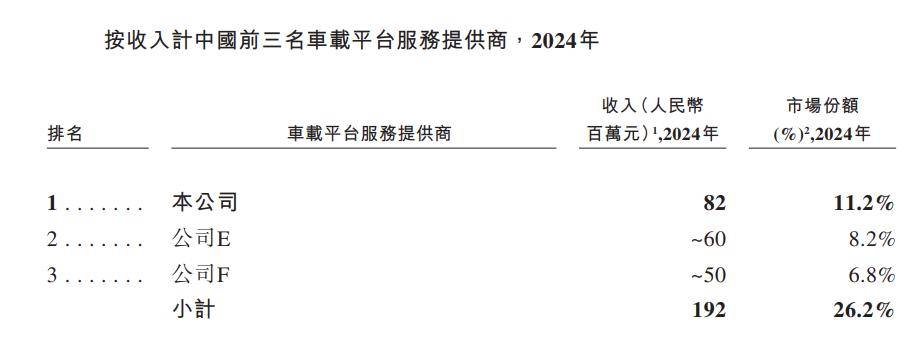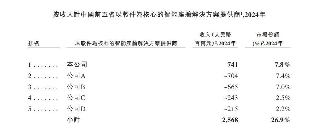 根据灼识咨询的资料,按2024年收入计算,斑马智行是中国最大的以软件为核心的智能座舱解决方案供应商,同时根据同一资料来源,按解决方案搭载量计算亦排名第一。