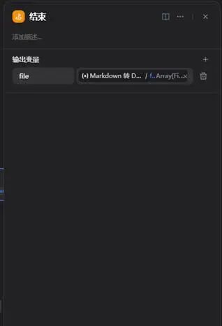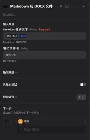 5、markdown转docx文件节点:将LLM生成的markdown格式输出内容转成word文件