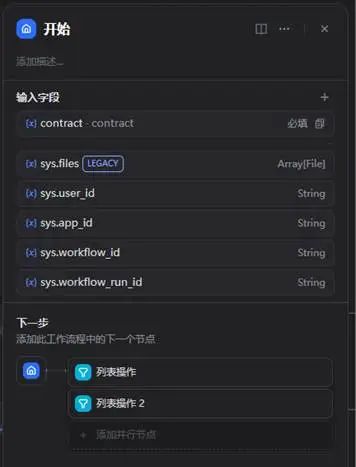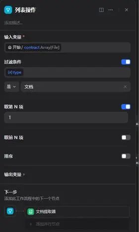 2、列表操作节点:用户上传多个合同时,提取单个合同文件