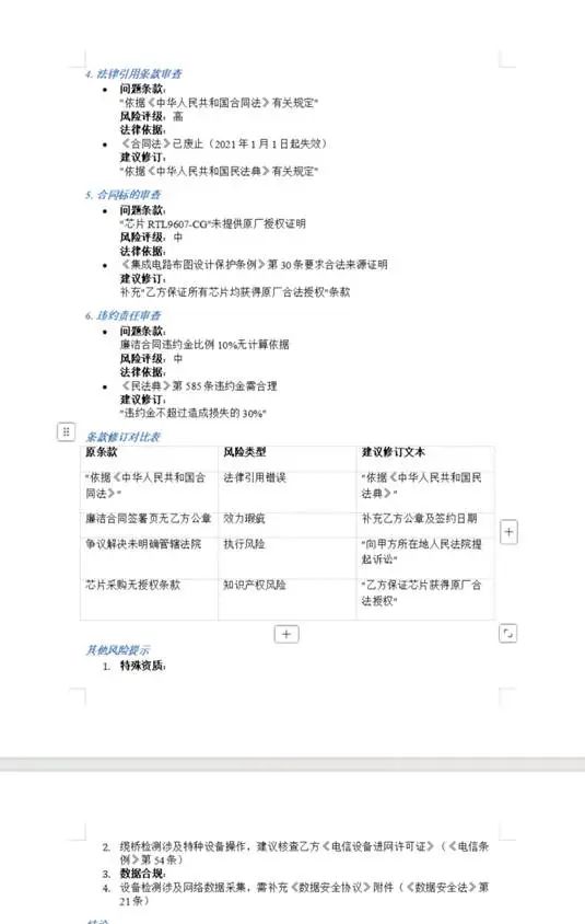 该应用可支持单个、多个合同多维度审查,结构化报告输出【审计可追溯】:条款定位、风险描述、依据参考、建议修改。