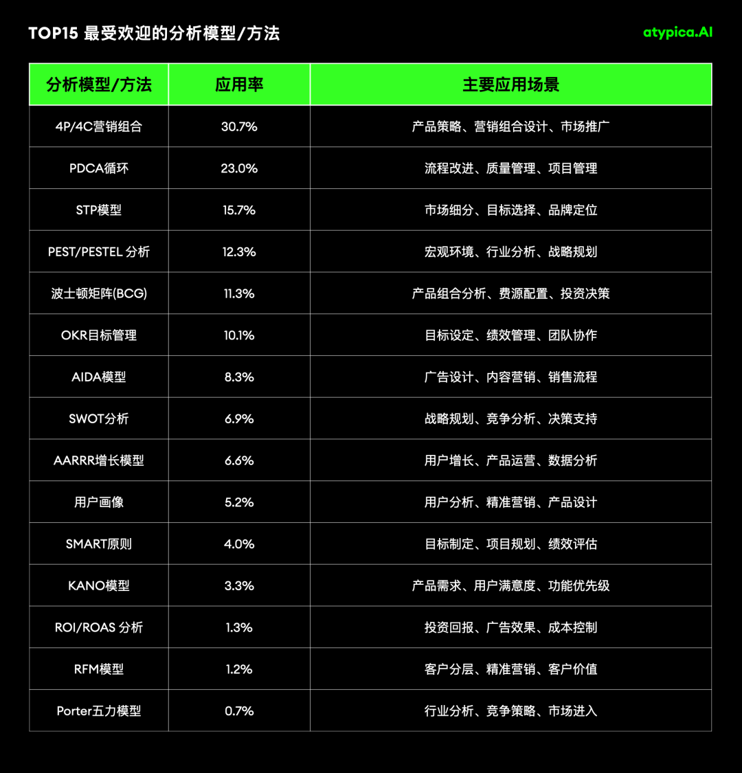 根据我们平台5000+用户的抽样数据,使用者覆盖创业者、咨询顾问、产品经理、市场人员、内容运营等多元角色,研究话题从用户画像、竞品分析到市场进入、商业模式设计,无所不包。最常被调用的分析模型是4P/4C营销组合、PDCA循环和STP模型。