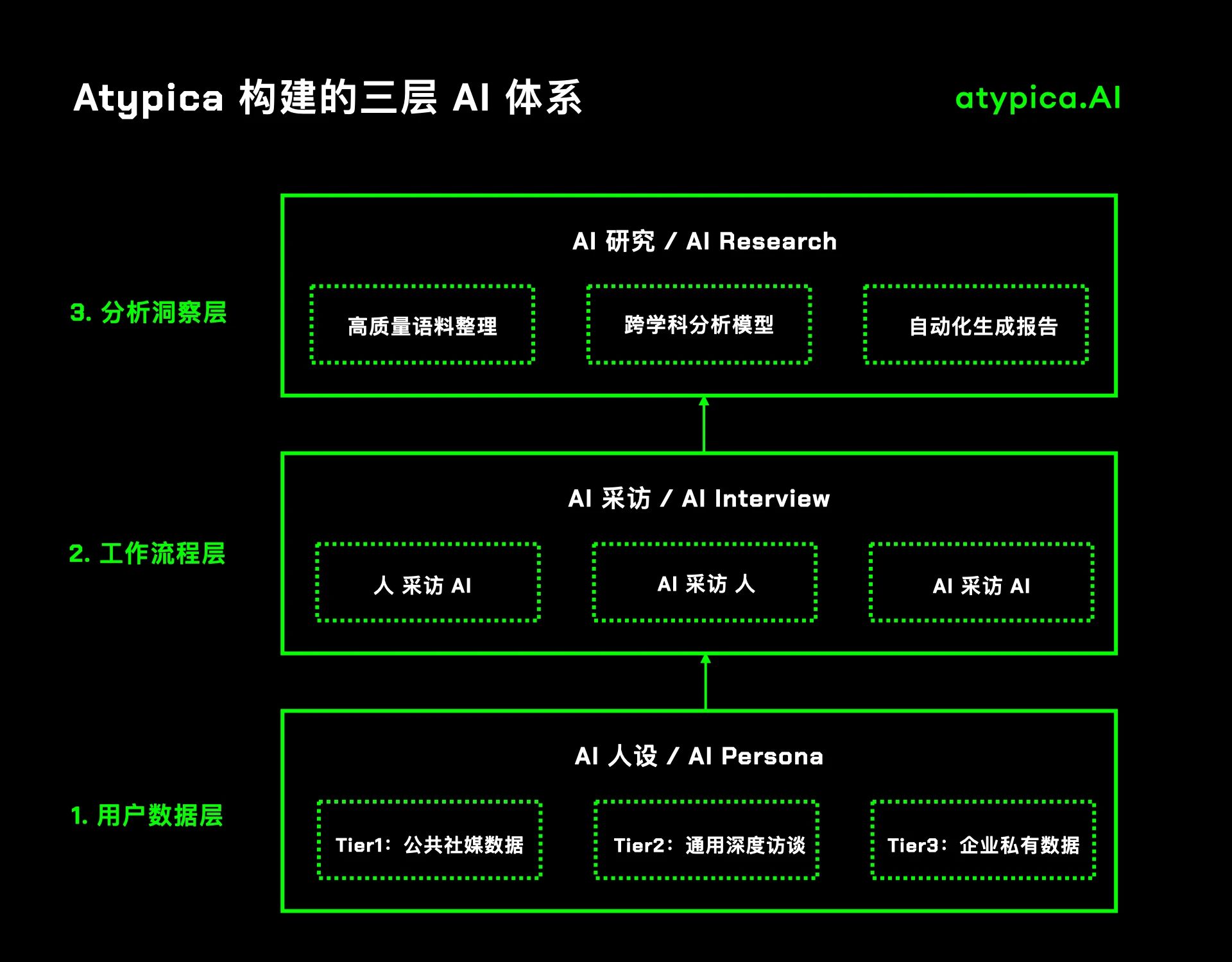 Atypica构建了三层技术架构,体现了内容数字化和内容人工智能的深度融合: