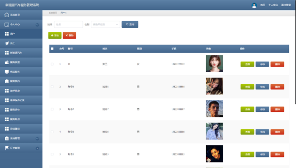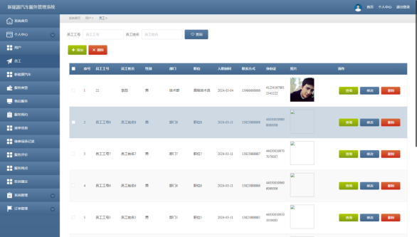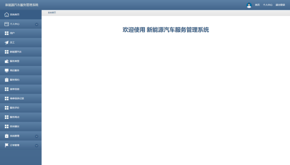 管理员进入主页面,主要功能包括对系统首页、个人中心、用户、员工、新能源汽车、服务类型、售后服务、服务预约、接单信息、维修保养记录、服务评价、服务网点、投诉建议、系统管理、订单管理等进行操作。管理员主页面如图5-6所示: