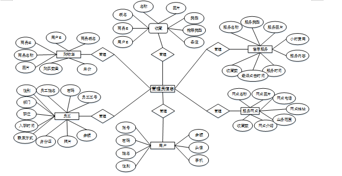 概念模型是对现实中的问题出现的事物的进行描述,ER图是由实体线以及关联构成的图,E-R图可以明确地叙述系统中涵盖的实体线相互关系。将“购物车、收藏、售后服务、服务网点、用户、员工”等作为实体,它们的局部E-R图,如图4-2所示:
