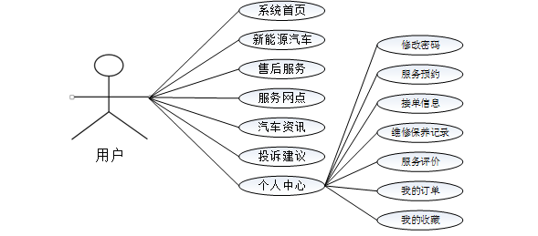 用户登录系统所涉及到的功能主要有修改密码、服务预约、接单信息、维修保养记录、服务评价、我的订单、我的收藏等功能。用户用例如图3-2所示。