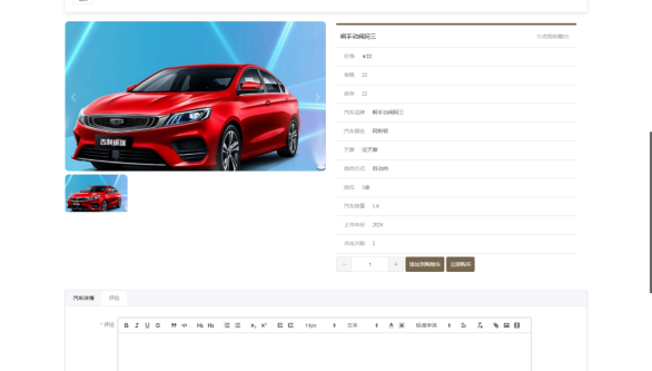 新能源汽车:在新能源汽车页面的输入栏中输入汽车名称、汽车品牌、汽车颜色、汽车排量或价格进行查询,可以查看到新能源汽车详细信息,并根据需要进行添加购物车、立即购买、评论或收藏等操作。新能源汽车页面如图5-3所示: