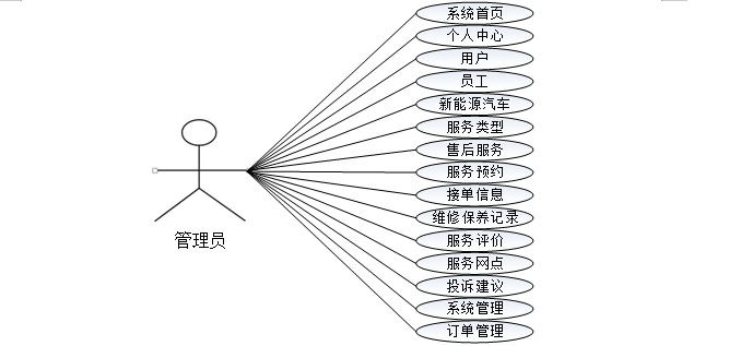 管理员登录系统所涉及到的功能主要有系统首页、个人中心、用户、员工、新能源汽车、服务类型、售后服务、服务预约、接单信息、维修保养记录、服务评价、服务网点、投诉建议、系统管理、订单管理等功能。管理员用例如图3-1所示。