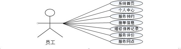 员工登录系统所涉及到的功能主要有系统首页、个人中心、服务预约、接单信息、维修保养记录、服务评价、服务网点等功能。员工用例如图3-3所示。